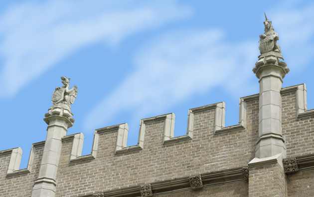 The school’s monumental square entrance towers, picturesque silhouette, asymmetrical massing, and assorted Gothic-inspired details typical of an english university have been restored.