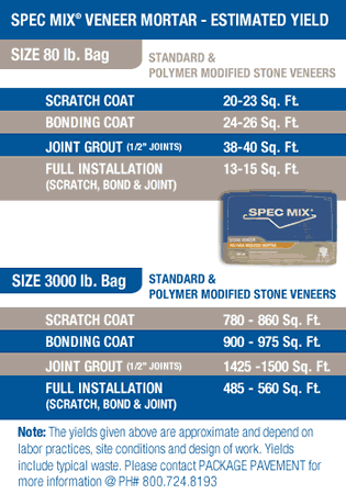 Product yield information can vary with each application but as a general rule the following guide can be used. As with all applications a sample mock-up should be tested to ensure the desired results on the project. For more information call Package Pavement @ (800) 724-8193 or visit www.specmix.com.